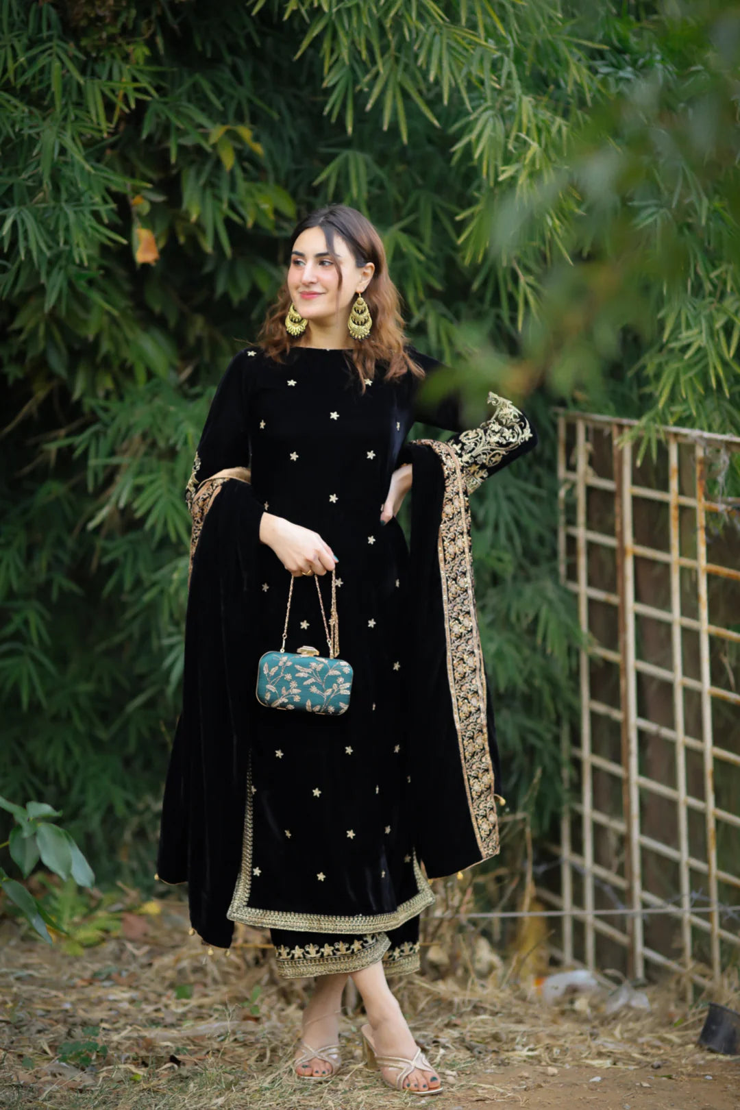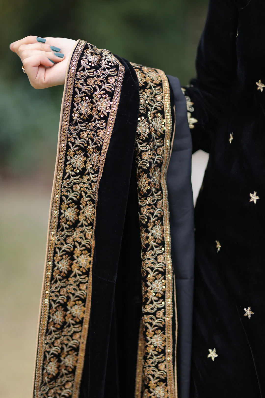 Zafir is a black embroidered outfit featuring rich golden detailing and a matching dupatta. Elegant, timeless, and perfect for formal occasions.